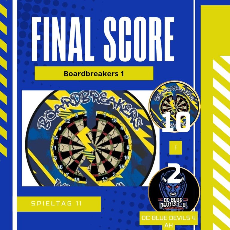 Das erste Doppel spielten Yvonne und Marcel. Die ersten 2 Legs konnten sie leider nicht gewinnen. Dafür das 3te Leg mit einem 57.8 Average. Das letzte Leg ging wieder leider verloren und somit stand es 1:3. Das letzte Doppel des Tages spielten Fabio und Elias. Das erste Leg ging leider verloren. Dafür konnten sie die letzten drei Legs gewinnen und holten somit einen Punkt für uns. So stand es jetzt am Ende des Spieltages 2:10 für die DC Blue Devils 3.